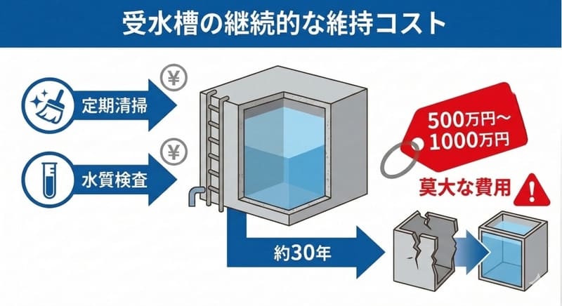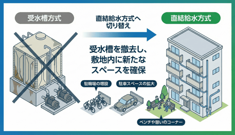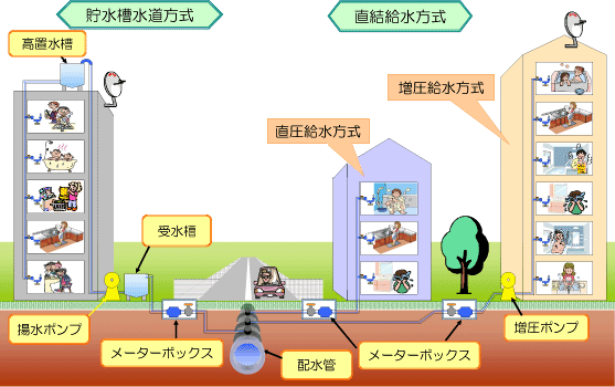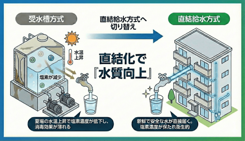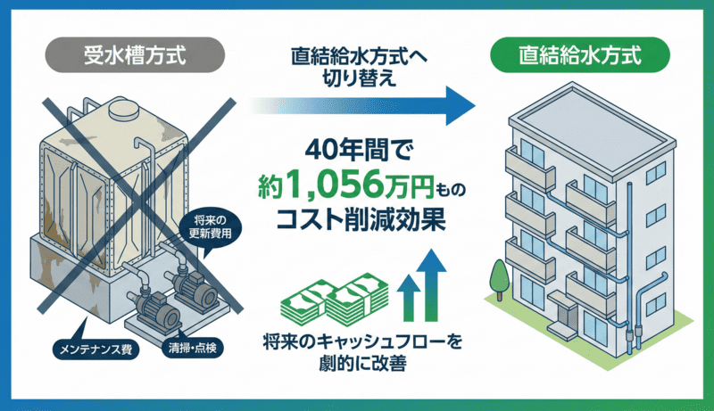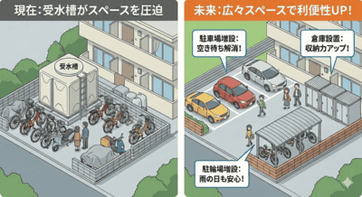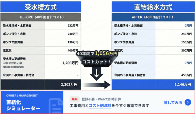 受水槽方式から直結給水方式への切り替えをオススメします 受水槽方式から直結給水方式に変更すると様々なメリットがあり、現在多くの建物において施工が進められています。 受水槽を交換してしまう前に一度”直結給水方式”への切り替えをご検討していただきたいです。 当ページでは直結給水方式の具体的なメリットや実際に切り替えた場合にいくらのコストカットができるかの直結化コストシミュレーターもご用意しております。 参照:東京都水道局公式HP(https://www.waterworks.metro.tokyo.lg.jp/kurashi/chokketsu/hukyu.html) 株式会社フジコーでは、名古屋市を中心に数多くの給水管改修工事や直結給水化工事を手掛けてまいりました。豊富な施工実績に基づき、建物の構造や利用状況に合わせた最適なプランをご提案いたします。「ウチの建物でも工事できるの?」「費用対効果を詳しく知りたい」といった疑問をお持ちのオーナー様は、ぜひ一度ご相談ください。 お問い合わせ フォームでお問い合わせ お問い合わせフォームからお気軽にお問い合わせください。 後日担当者よりご返信させていただきます。 LINEでお問い合わせ LINEに友だち追加いただくと、LINEのトークでお気軽にご相談いただけます。営業時間 平日9:00 – 17:00 受水槽方式の3つのデメリットについて 受水槽方式を使い続けることには、実はコストや衛生面でいくつかのデメリットが発生します。 ここでは、その中でも特に影響の大きい3つのポイントをご紹介します。 ①受水槽のメンテナンス費や維持費が高い 受水槽は維持するだけで継続的なコストがかかります。定期的な清掃や水質検査が必要になるだけでなく、設備自体の寿命も考慮しなければなりません。 特に約30年ごとのタンク交換時には、受水槽の容量により500万円~1000万円もの莫大な費用が発生するため、金銭的な影響は甚大です。 ②デッドスペースが生まれてしまう 受水槽は敷地内で大きなスペースを占有してしまいます。 この場所が空けば、不足しがちな「駐輪場」や「駐車場」の増設、あるいは「倉庫」の設置など、入居者の利便性を高めるスペースとして有効活用することが可能です。 ③夏場の水質悪化 水道水は衛生維持のために塩素消毒されていますが、夏季の高温環境下では、貯水槽内で滞留中に残留塩素の濃度が低下する傾向にあります。消毒作用のある塩素が減少することで、細菌等の微生物が増殖しやすくなり、結果として水質の低下を招く恐れがあります。 直結給水方式で全て解消できます ①直結給水化で「コストカット」 「受水槽方式」から「直結給水方式」へ切り替えることで、受水槽に関連するメンテナンス費や将来の更新費用が一切不要になります。 4階建て・10戸・10tのマンションで行ったシミュレーションでは、40年間で約1,056万円ものコスト削減効果が試算されています。直結給水化は、将来のキャッシュフローを劇的に改善することができます。 直結給水化シミュレーターについて 「受水槽方式」から「直結給水方式」へ切り替えた場合、将来的にどれほどのコストメリットがあるのか、弊社オリジナルの無料で使える「直結化シミュレーター」で算出してみませんか? 清掃費、電気代、ポンプ交換費用など、見落としがちな長期メンテナンス費用を網羅。面倒な登録は一切不要、完全無料で今すぐ診断いただけます。10年、20年、40年先を見据えた賢い修繕計画の第一歩として、ぜひご活用ください。 ②直結給水化で「スペースの確保」 「受水槽方式」から「直結給水方式」へ切り替え、受水槽を撤去することで、敷地内に新たなスペースを確保することができます。 これまで受水槽が占有していた空間を有効活用することで、慢性的な不足が課題となっている「駐輪場の増設」や、来客時にも便利な「駐車スペースの拡大」が可能になります。また、「ベンチや憩いのコーナー」を設置することで、居住者様同士のコミュニケーションを育む心地よい共用空間へと生まれ変わらせることもできます。 ③直結化で「水質向上」 「直結給水方式」に切り替えると、水道本管から蛇口まで直接水が届くようになります。 受水槽で滞留することがないため、常に新鮮な水が供給され、適切な塩素濃度が保たれることで、より衛生的で安全な水を利用することができます。直結化は、コスト削減だけでなく、居住者の皆様の健康と安心な暮らしにも貢献します。 施工事例 直近の直結化工事例 年 月 区名 階数 戸数 形態 令和8年 2月 中区 7階 20戸 ビル 令和8年 1月 天白区 3階 18戸 マンション 令和8年 1月 緑区 3階 31戸 マンション 令和7年 12月 天白区 4階 6戸 ビル 令和7年 11月 瑞穂区 3階 3戸 マンション 令和7年 7月 中区 4階 8戸 ビル お問い合わせ フォームでお問い合わせ お問い合わせフォームからお気軽にお問い合わせください。 後日担当者よりご返信させていただきます。 LINEでお問い合わせ LINEに友だち追加いただくと、LINEのトークでお気軽にご相談いただけます。営業時間 
